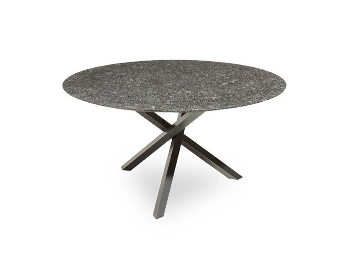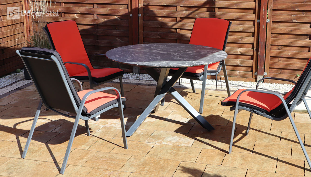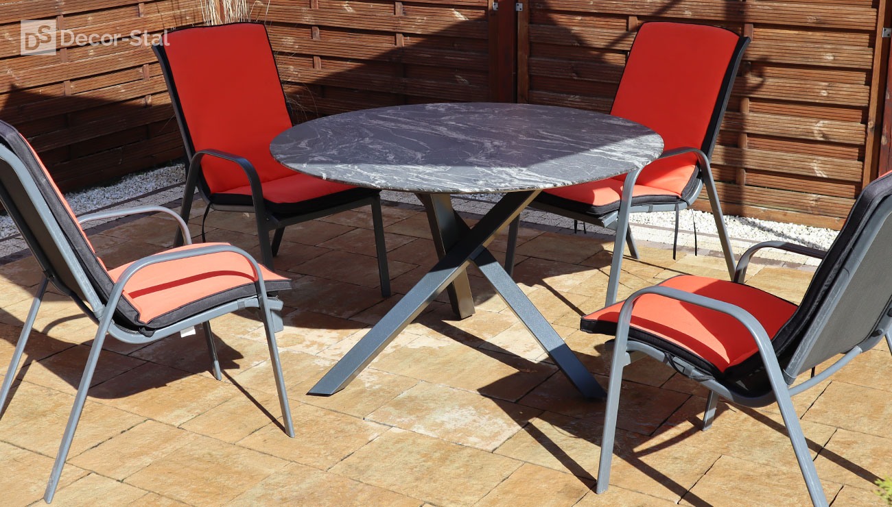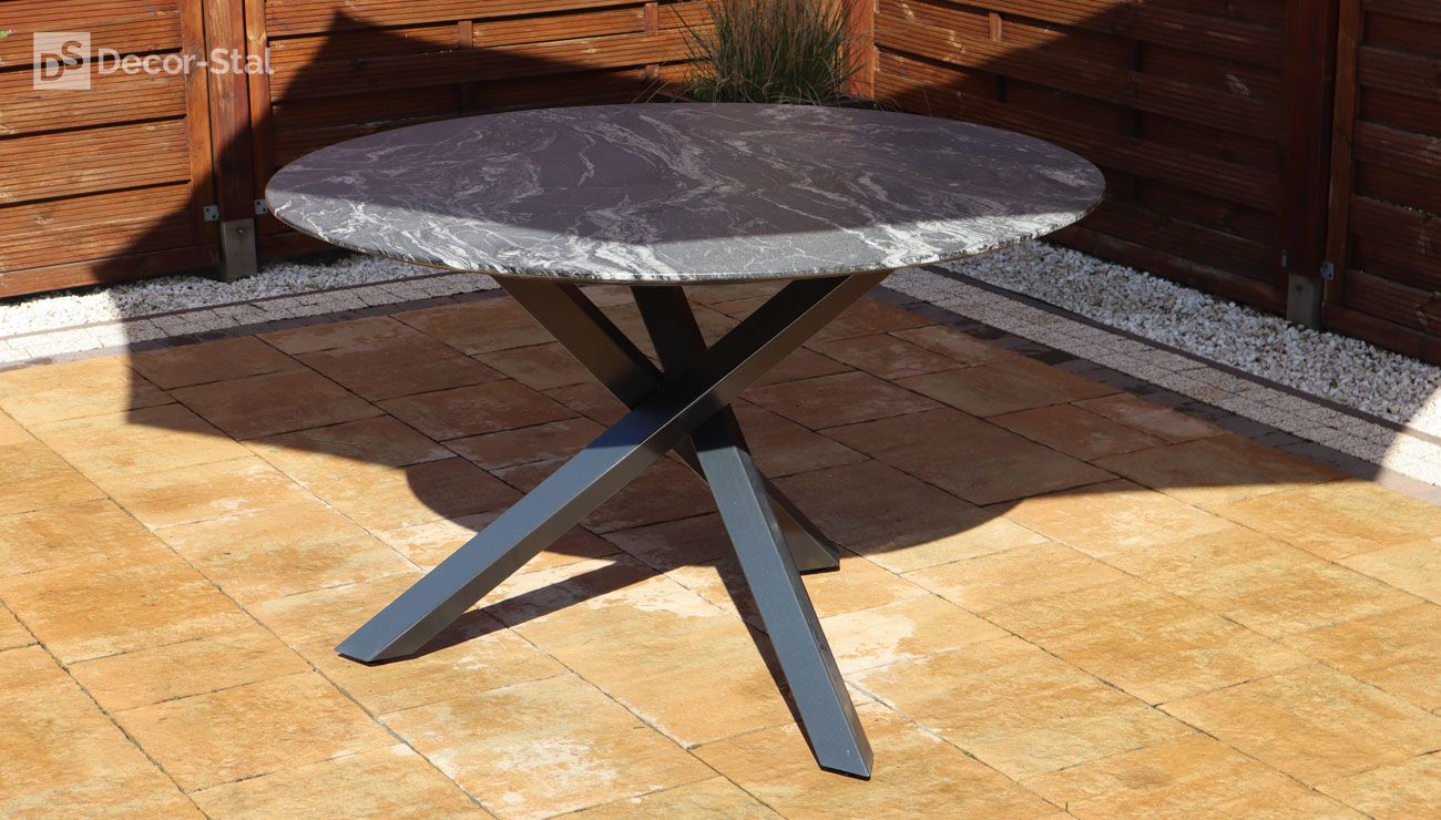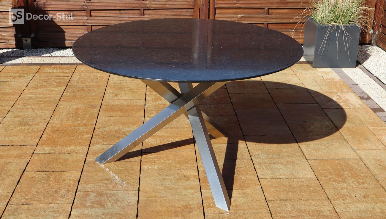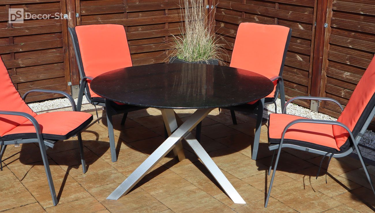 Porto to dizajnerski stół z okrągłym blatem o średnicy 120 lub 140cm. Swoim wyglądem przyciąga wzrok w ogrodzie i na tarasie. Podstawa jest wykonana z profilu 6x6 ze stali nierdzewnej lub malowanej proszkowo. Blaty granitowe o grubości 2cm.